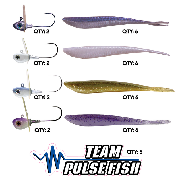 2025 Team Bundles includes Qty: 4 [2 Pack] Pulse Jigs, Qty: 4 [6 Pack] Soft Plastic Trailers, and Qty: 5 Team Pulse Fish Decals